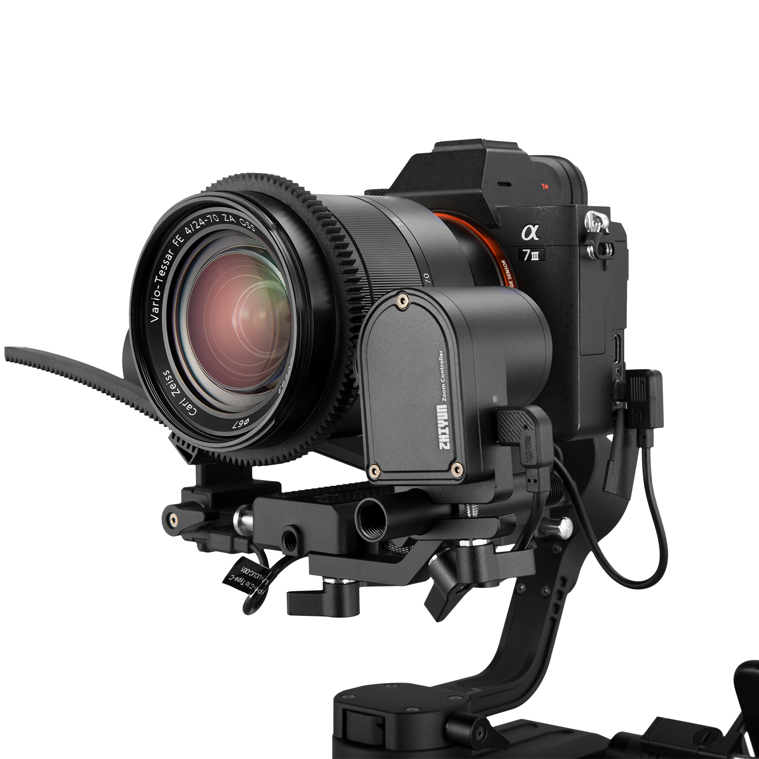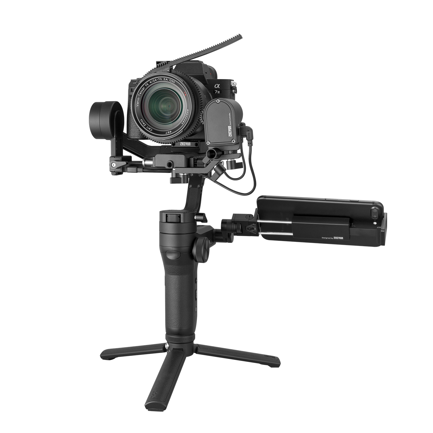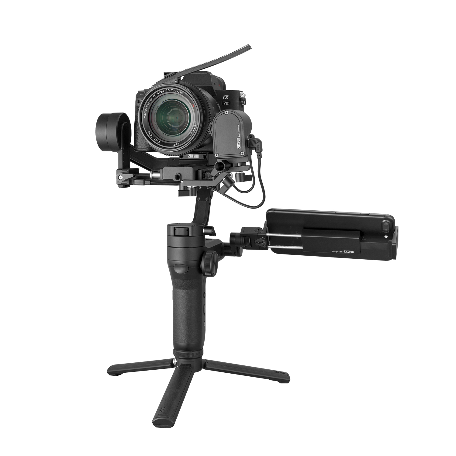 The Zhiyun-Tech TransMount Max Servo Zoom/Focus Controller can be used interchangeably for zoom and focus control on the Crane 3-Lab and WEEBILL LAB gimbals. It has a powerful-enough motor to control zoom, whereas the lighter-weight TransMount Lite is designed for focus control only.