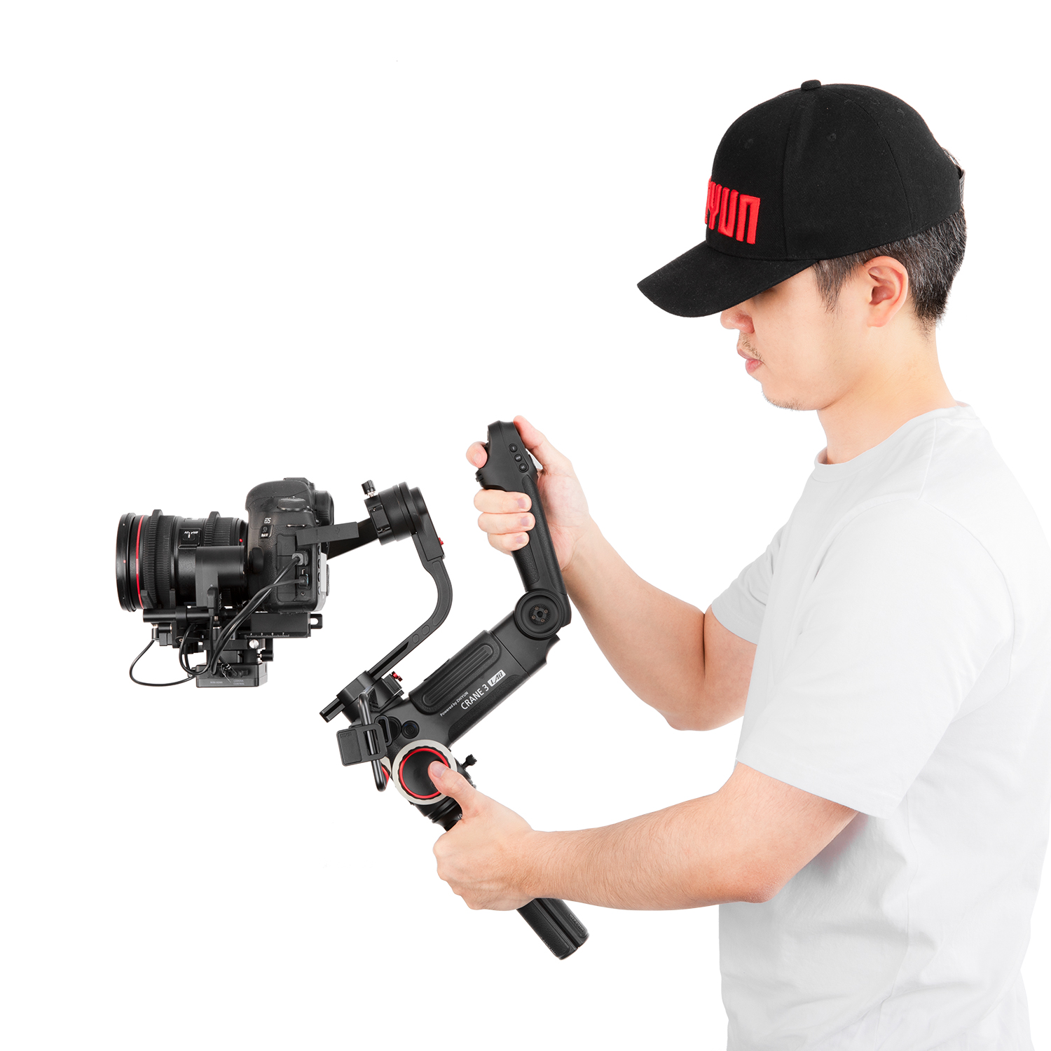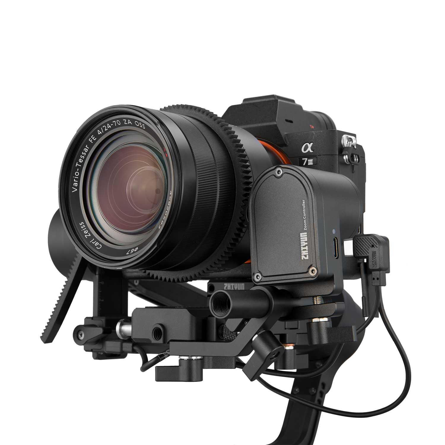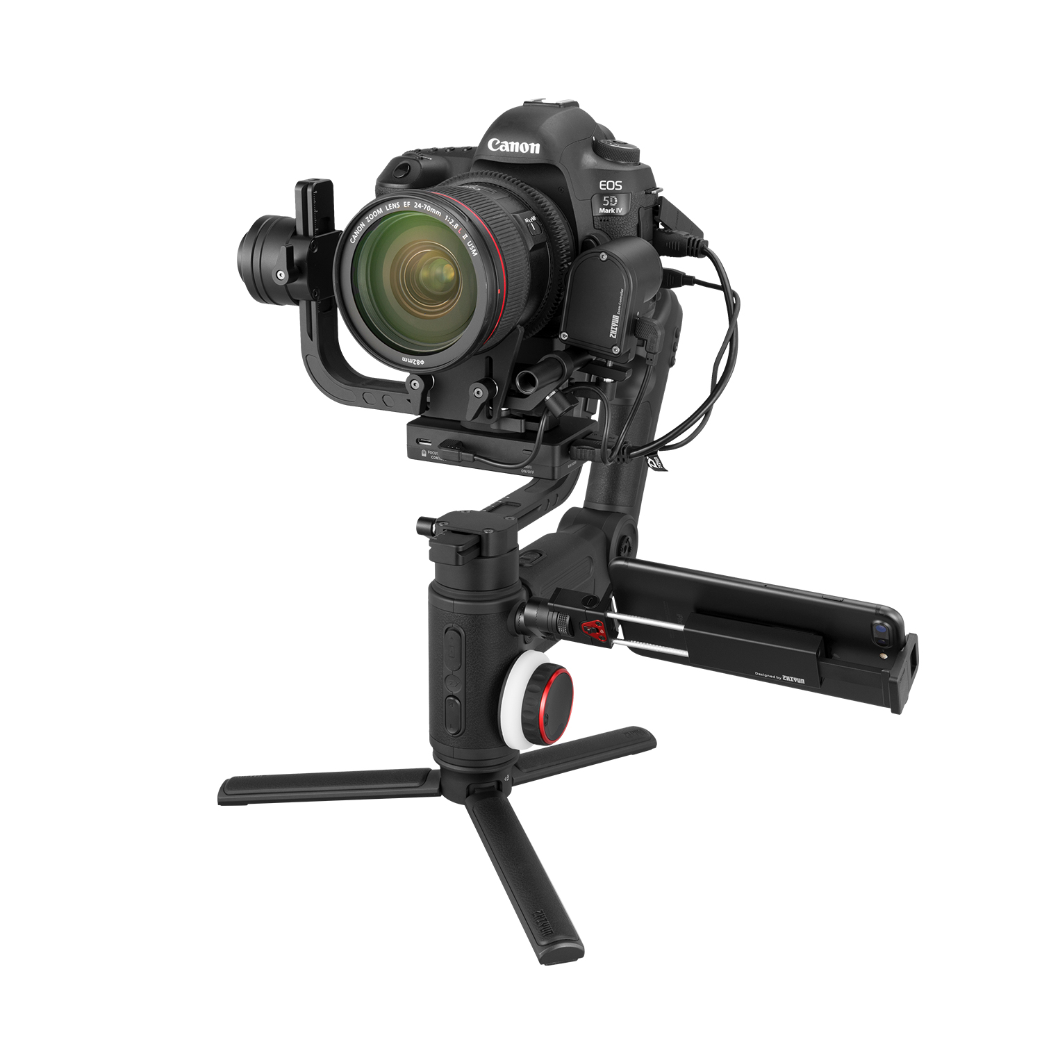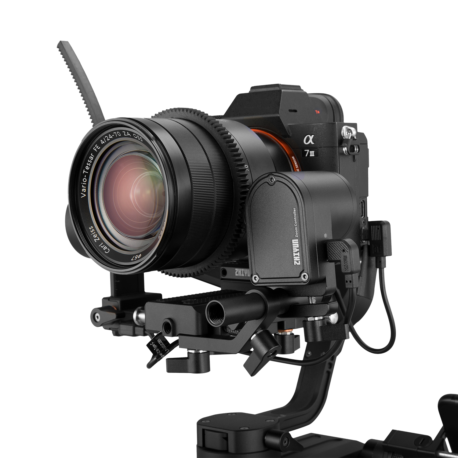 The Zhiyun-Tech TransMount Max Servo Zoom/Focus Controller can be used interchangeably for zoom and focus control on the Crane 3-Lab and WEEBILL LAB gimbals. It has a powerful-enough motor to control zoom, whereas the lighter-weight TransMount Lite is designed for focus control only.