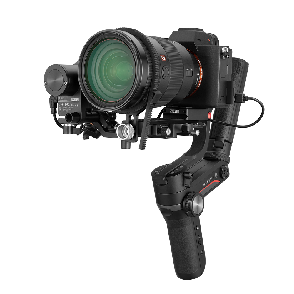 The WEEBILL-S Zoom/Focus Pro Package from Zhiyun-Tech includes the WEEBILL-S gimbal with everything it normally comes with, plus the TransMount Max lens motor, a quick release baseplate, and a second mini tripod. The lens motor has the torque to control focus or zoom and can be lined up to either lens gear interchangeably. It can be operated using the gimbal handwheel or the companion iOS/Android app. The quick release baseplate lets you move the camera between the gimbal and optional TransMount Multifunctional Camera Belt or Gimbal Bag.